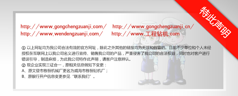威海市棟恒鉆機廠隸屬于文登市工程鉆機廠,主要生產(chǎn)、銷售工程鉆機。它坐落于文登市西鋪頭工業(yè)園,這里科技發(fā)達,交通便利,制造業(yè)集中。 自1982年建廠以來,經(jīng)過多年的優(yōu)化改革和沉淀積累,擁有精密、大型加工設(shè)備近百臺的生產(chǎn)企業(yè)之一?,F(xiàn)在研制成功的GJ-400、GJ-250S、GJ-250A、GJ-240S、GJ-240A、GJ-180S、GJ-180A型等鉆機。在其它產(chǎn)品上,企業(yè)建立了長期、中期、短期的發(fā)展規(guī)劃,一系列的高性能產(chǎn)品正在不斷推出中,企業(yè)應市場需求對系列產(chǎn)品進行了優(yōu)化組合,開發(fā)了與之對應配套的三腿、四腿單天車輪、雙天車輪鉆塔;泥漿泵—BW-160Q、BW- 200Q型球形閥泥漿泵大大提高了泵的使用性能和機械效率